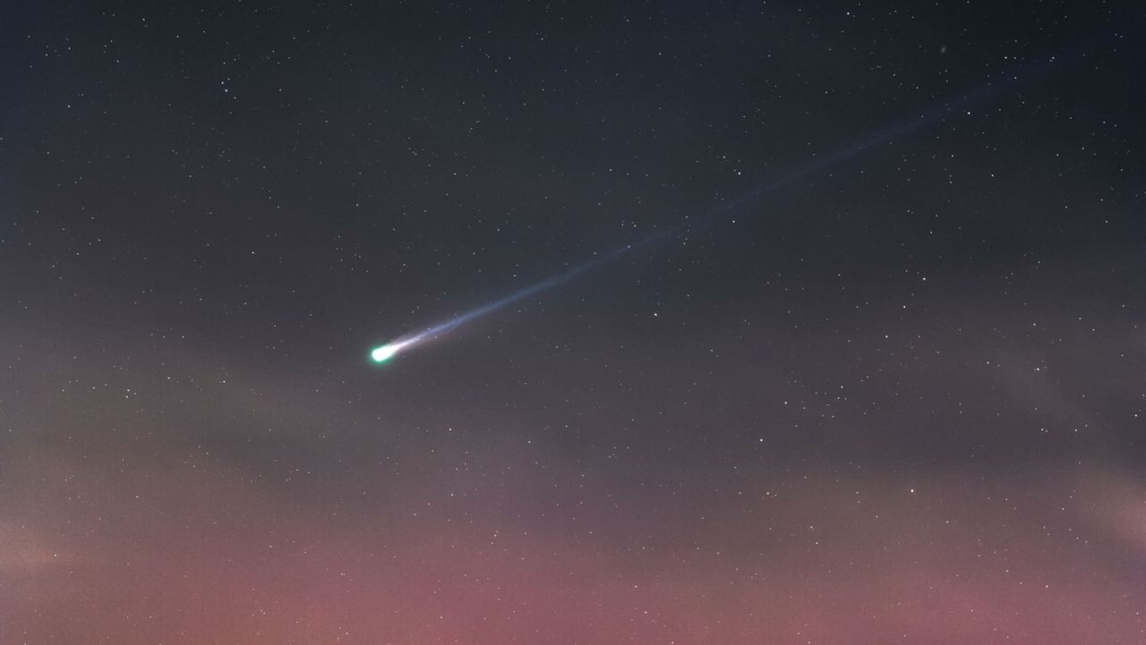 Dury worked through haze and high wind to capture a breathtaking shot of the distant night sky visitor using his Sony A7S III camera in concert with a Sigma 135mm F/1.4 Art lens, as a diffuse pink aurora glowed close to the horizon. “I would say in this instance, the weather was more the challenge,” Dury told Space.com. “With anti-cyclonic gloom affecting the weather for the best part of a week or more, there wasn’t much opportunity to photograph the comet from here in the West Country. Taken from higher ground, I was surrounded by haze, mist and fog.”