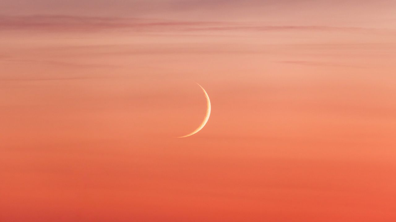 a very thin crescent moon with just a whisper of light illuminating the lower portion of the crescent.